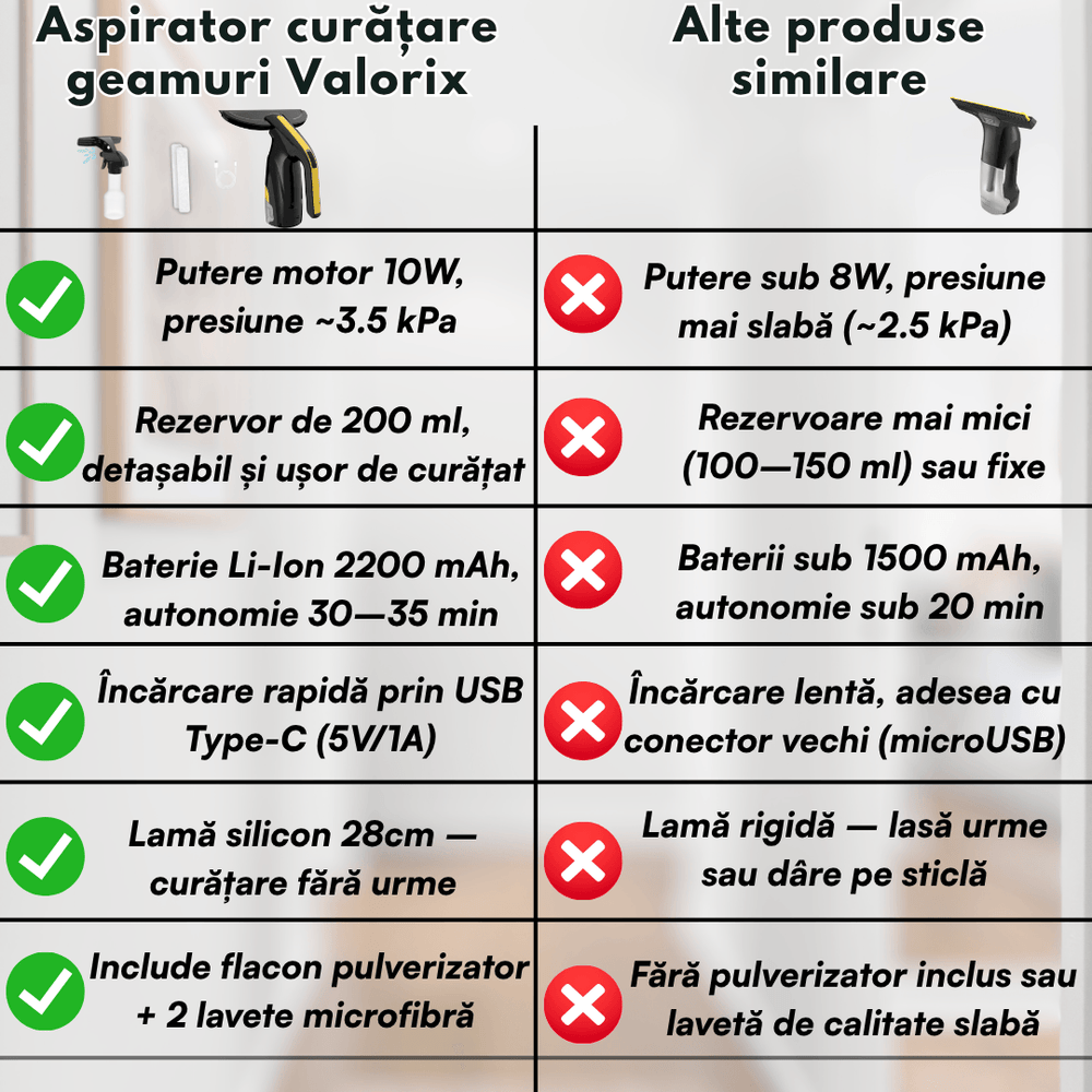 Bucură-te de geamuri impecabile cu aspiratorul Valorix® PRIME. Cu putere de aspirație mare, autonomie extinsă și rezervor generos, este alegerea perfectă pentru curățenie rapidă și eficientă.
